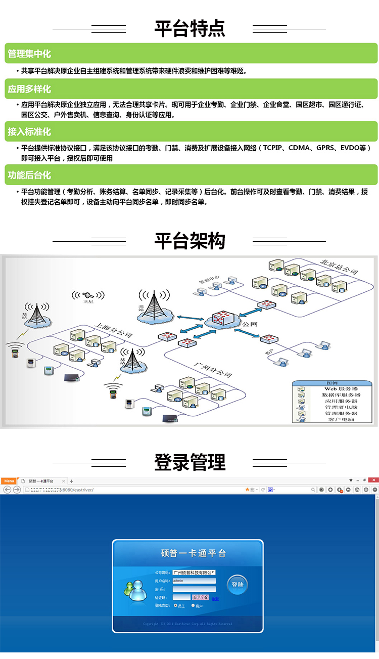 一卡通B/S云平台集考勤,消费,门禁,通道,停车,派车,巡更终端设备管理、卡务于一体,打造一个省(市)级一卡通应用平台;平台软件采用B/S架构,系统基于J2EE体系结构,采用SSH技术架构进行开发,采用主流JAVA语言开发,系统可跨多种操作系统部署,平台支持多种主流数据库的功能( MSSQL2008、MSSQL2012);终端设备采用UDP通讯方式,支持广域网通信不需要做端口转发,方便终端安装、部署;