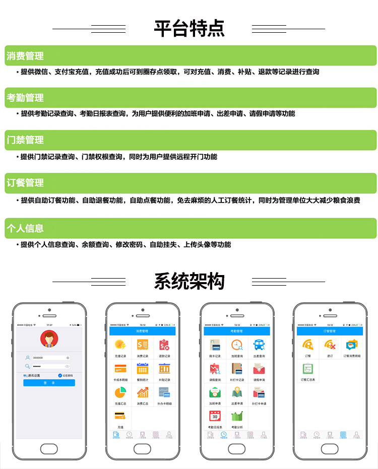 APP掌易通提供微信、支付宝充值,充值成功后可到圈存点领取,可对充值、消费、补贴、退款等记录进行查询,考勤记录查询、考勤日报表查询,为用户提供便利的加班申请、出差申请、请假申请等,提供门禁记录查询、门禁权根查询,同时为用户提供远程开门功能,提供自助订餐功能、自助退餐功能,自助点餐功能,免去麻烦的人工订餐统计,同时为管理单位大大减少粮食浪费,提供个人信息查询、余额查询、修改密码、自助挂失、上传头像等功能。
